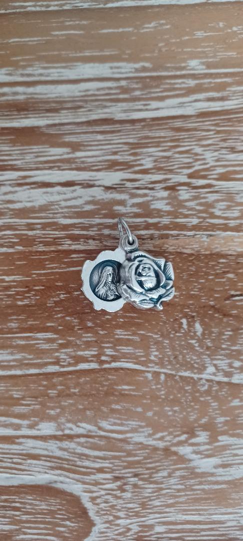 Este lindo pingente Flor, feito em Metal,com a imagem de Sta Teresinha no lado de dentro.